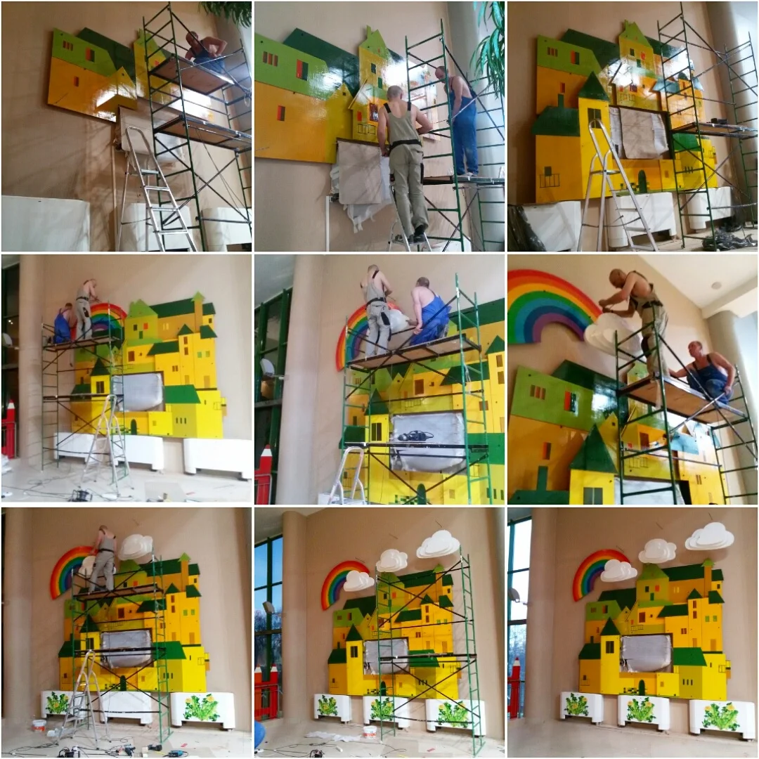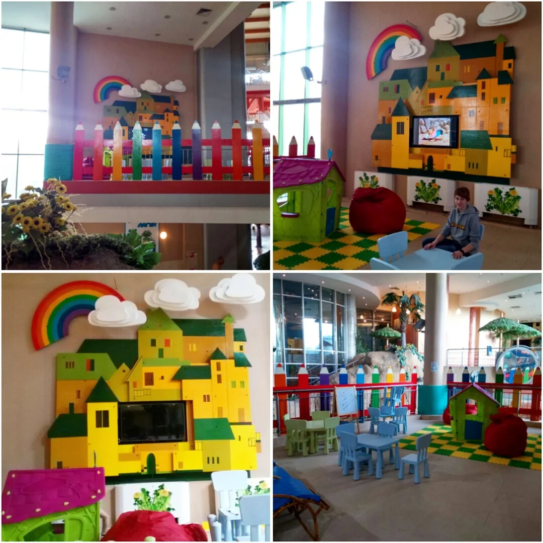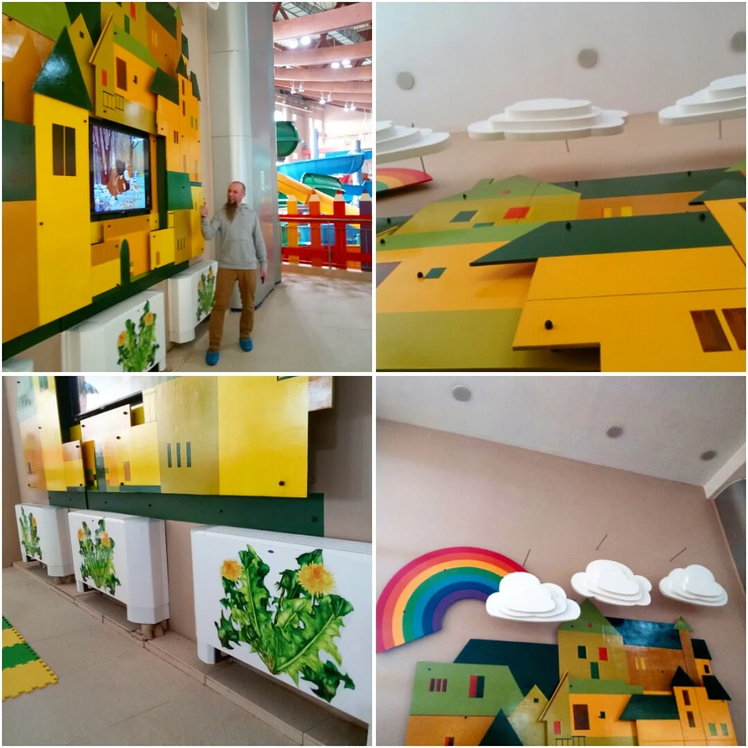 Расскажу подробнее о каждой части декораций. Главным элементом детской зоны является большая многоуровневая конструкция волшебного города, выполненная в ярких жёлто-зелёных тонах. Размер этой декорации 5 метров в длину и 4 метра в высоту. Над городом сияет волшебная радуга и плывут белые облака. Игровая зона расположена на балконе аквапарка, поэтому при разработке проекта пришлось подумать о безопасности маленьких посетителей. В качестве дополнительного ограждения и, в тоже время элемента декора зоны мы использовали забор в виде цветных карандашей. Получилось, с одной стороны безопасно, с другой стороны очень ярко и привлекательно.