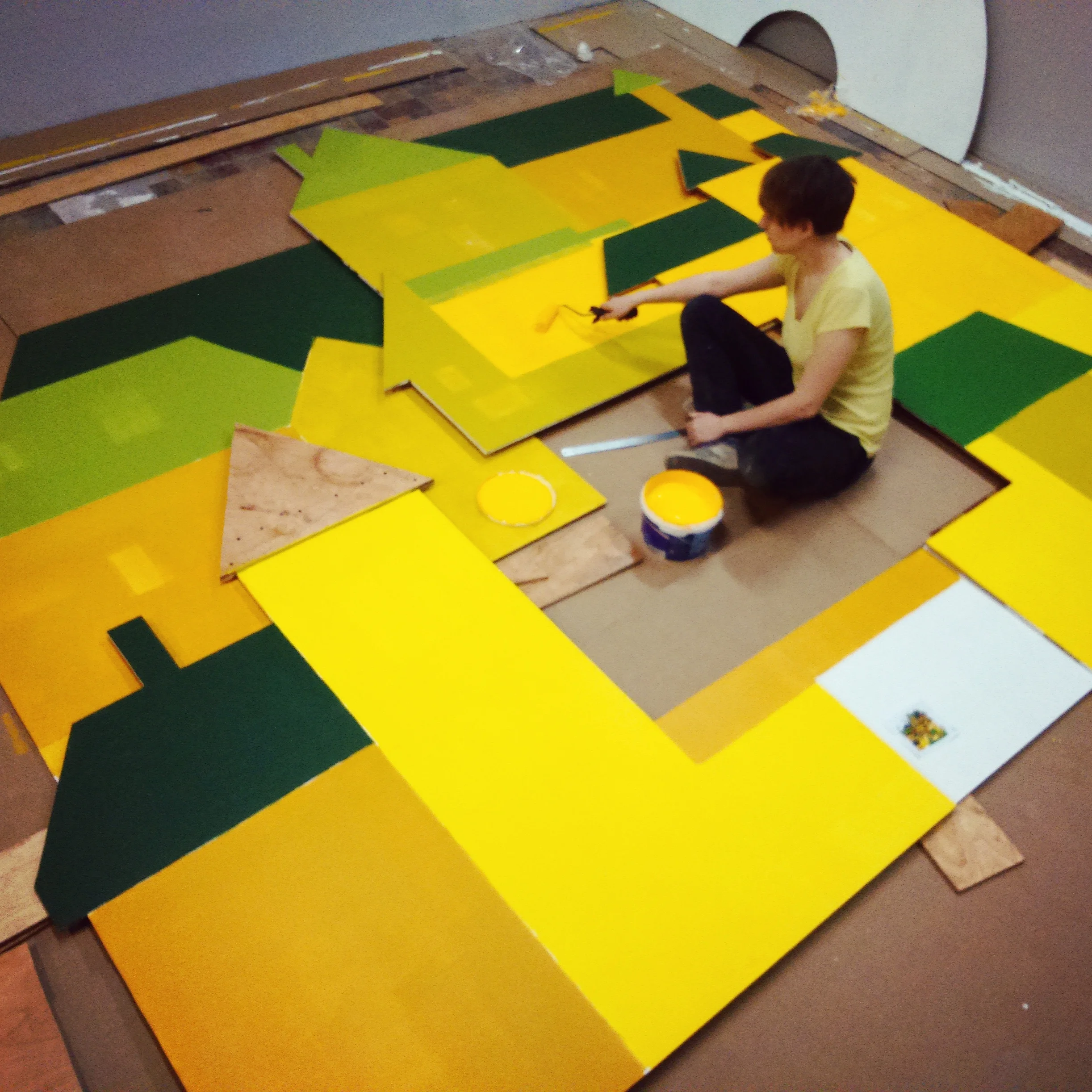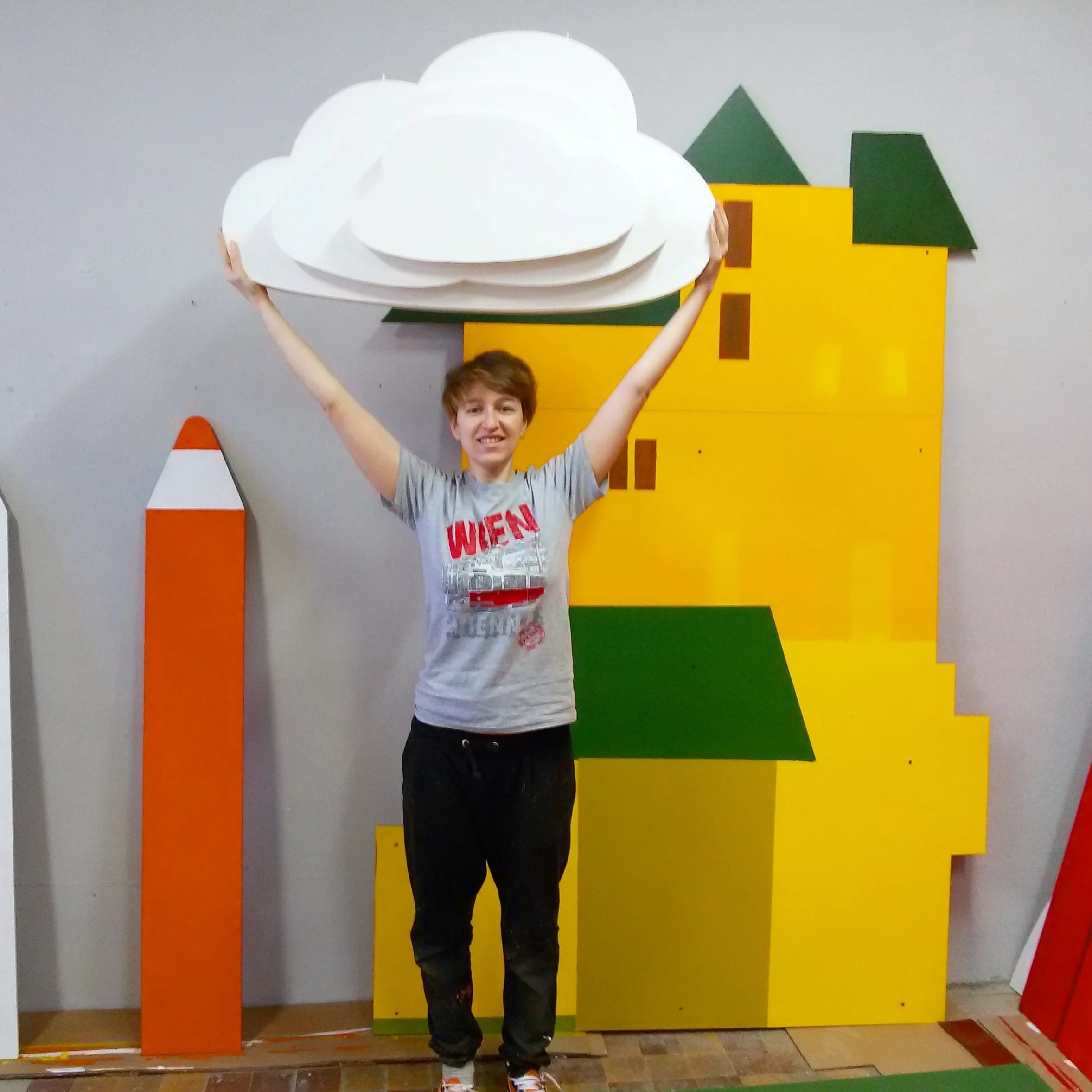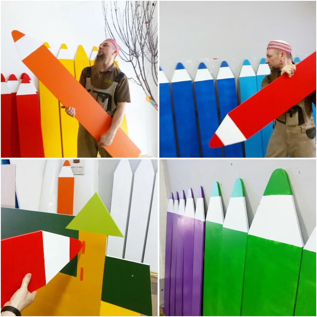 Расскажу подробнее о каждой части декораций. Главным элементом детской зоны является большая многоуровневая конструкция волшебного города, выполненная в ярких жёлто-зелёных тонах. Размер этой декорации 5 метров в длину и 4 метра в высоту. Над городом сияет волшебная радуга и плывут белые облака. Игровая зона расположена на балконе аквапарка, поэтому при разработке проекта пришлось подумать о безопасности маленьких посетителей. В качестве дополнительного ограждения и, в тоже время элемента декора зоны мы использовали забор в виде цветных карандашей. Получилось, с одной стороны безопасно, с другой стороны очень ярко и привлекательно.