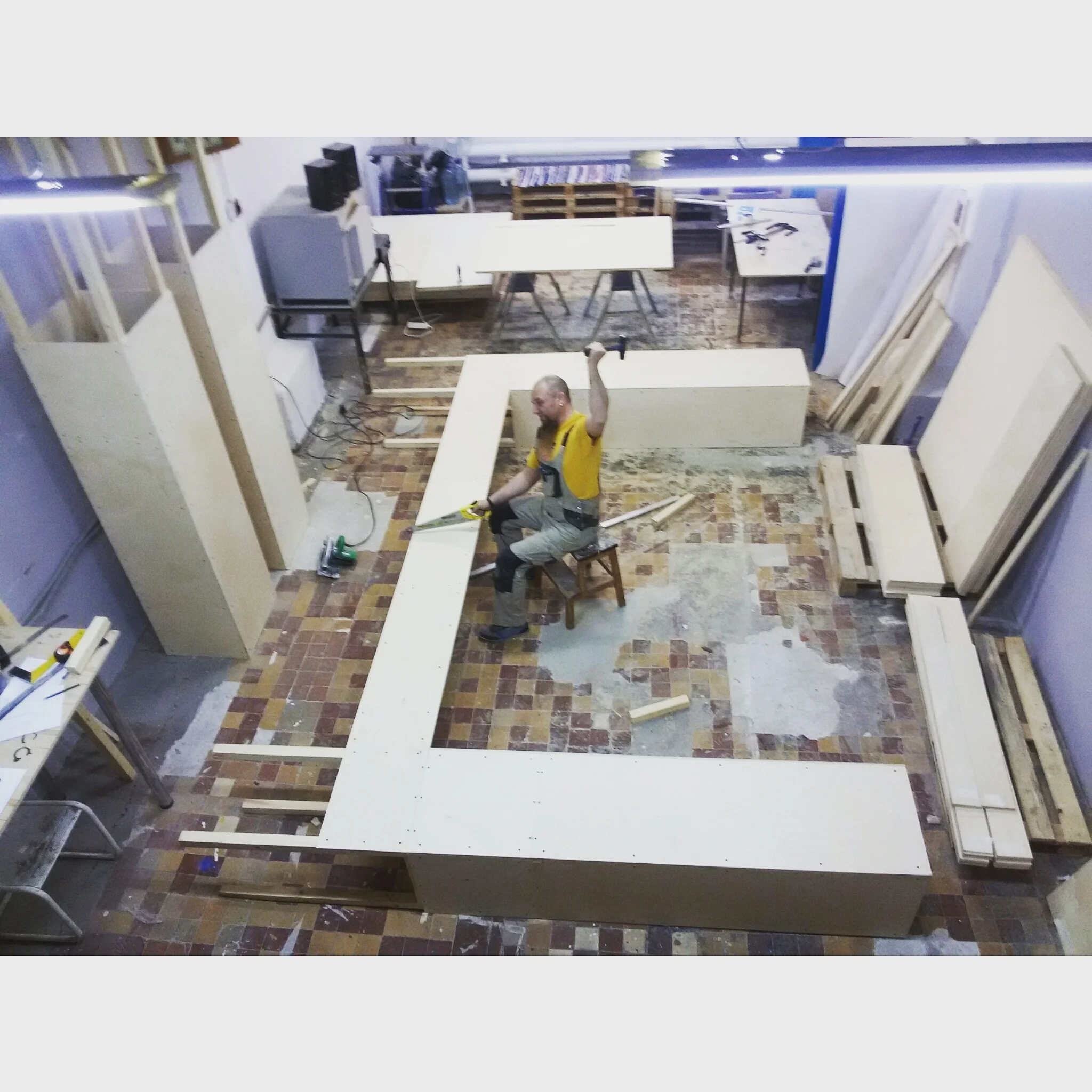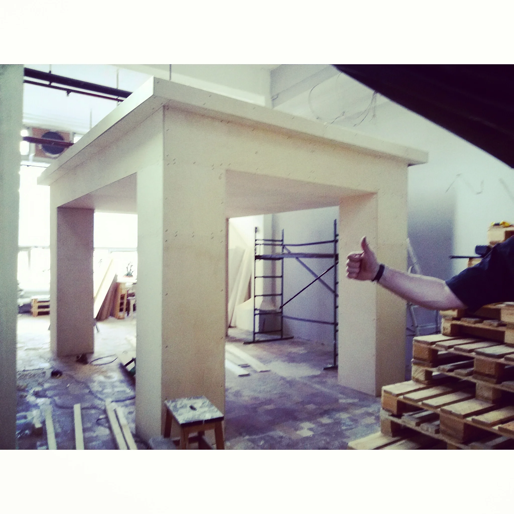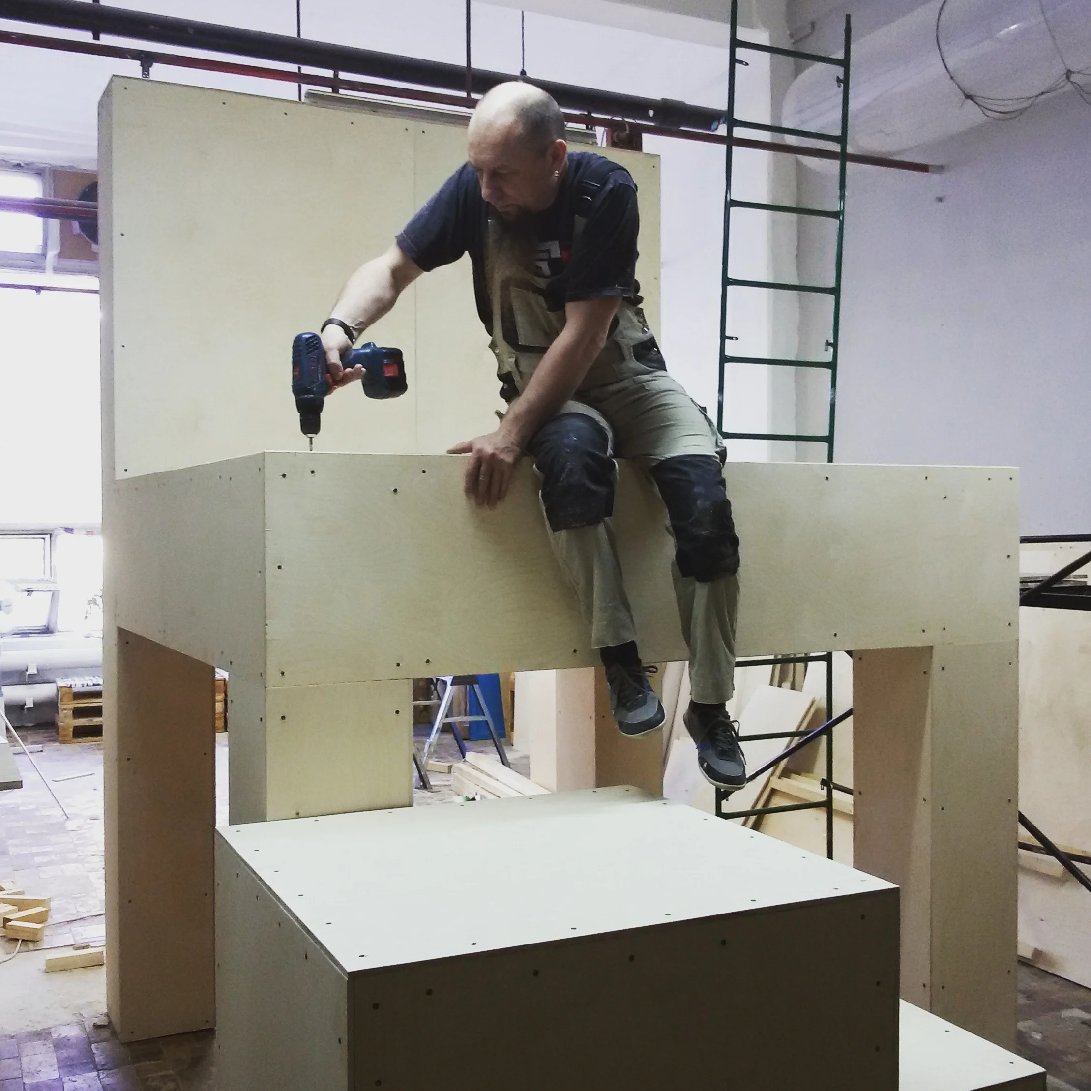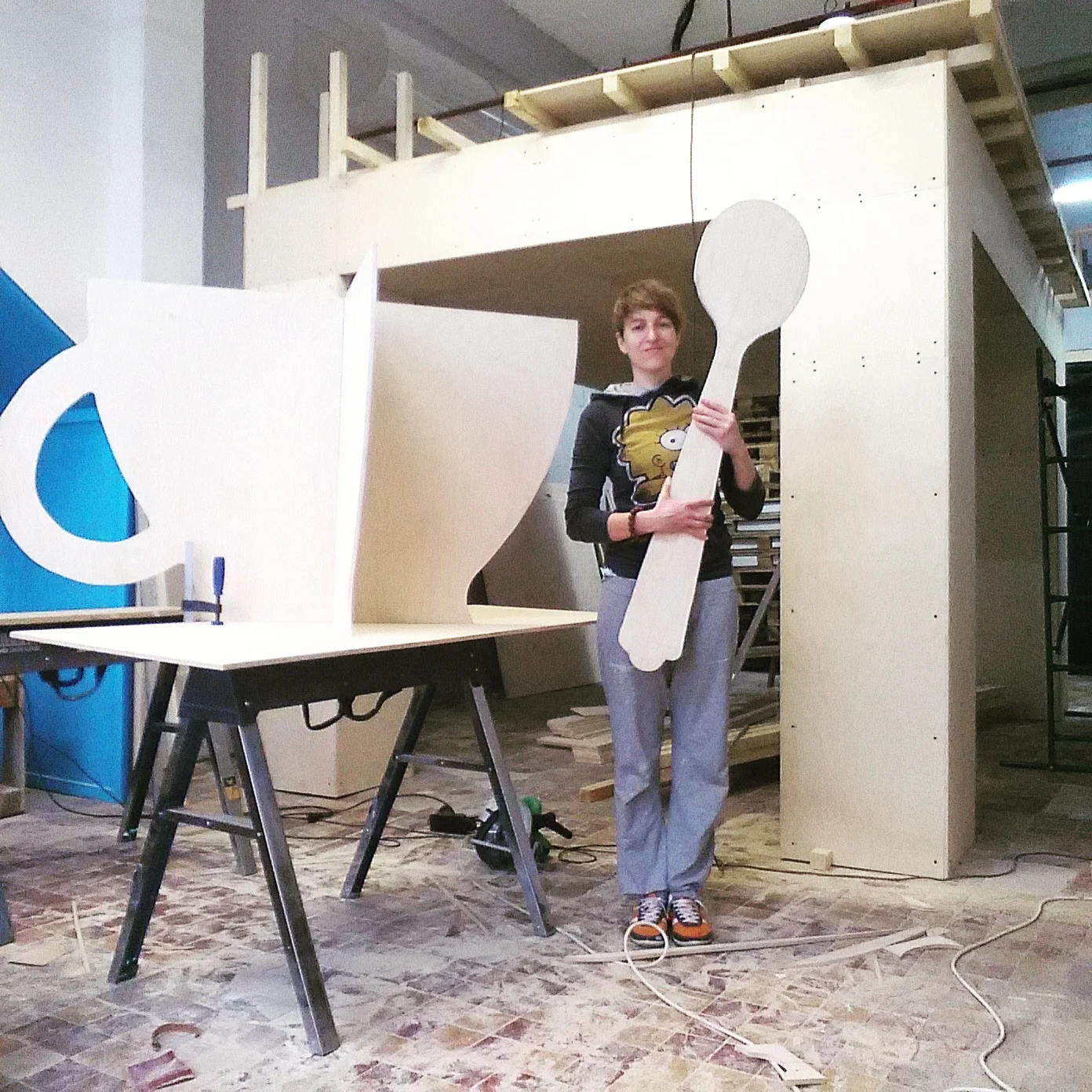 Полтора кубометра качественной фанеры на облицовку конструкции, десятки погонных метров бруса на каркас, килограммы шурупов и литры краски, не говоря уж о десятках человекочасов кропотливого труда ушло у нас на изготовление этих декораций. Но оно того стоило! Доставку к месту монтажа пришлось осуществлять на огромном большегрузном автомобиле, а собирать конструкции в течение 2 ночей при свете прожекторов. Зато ГИГАНТСКУЮ МЕБЕЛЬ для чаепития, созданную в Мастерской "Пункт М", можно было легко увидеть проезжая по МКАДу с расстояния пару километров у главного входа в торговый центр "МЕГА Тёплый Стан".