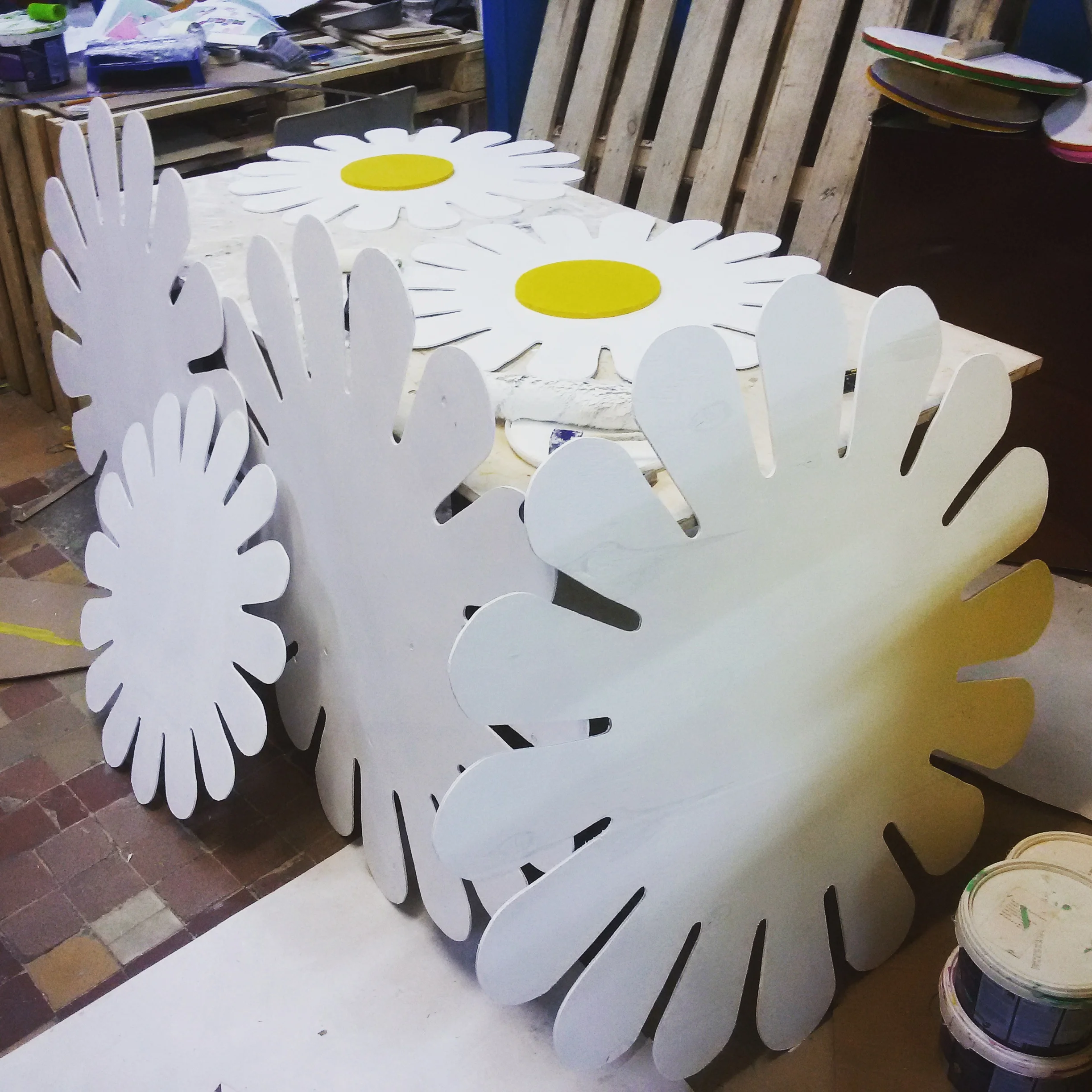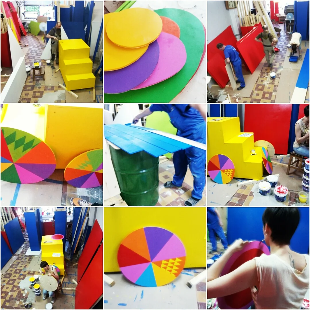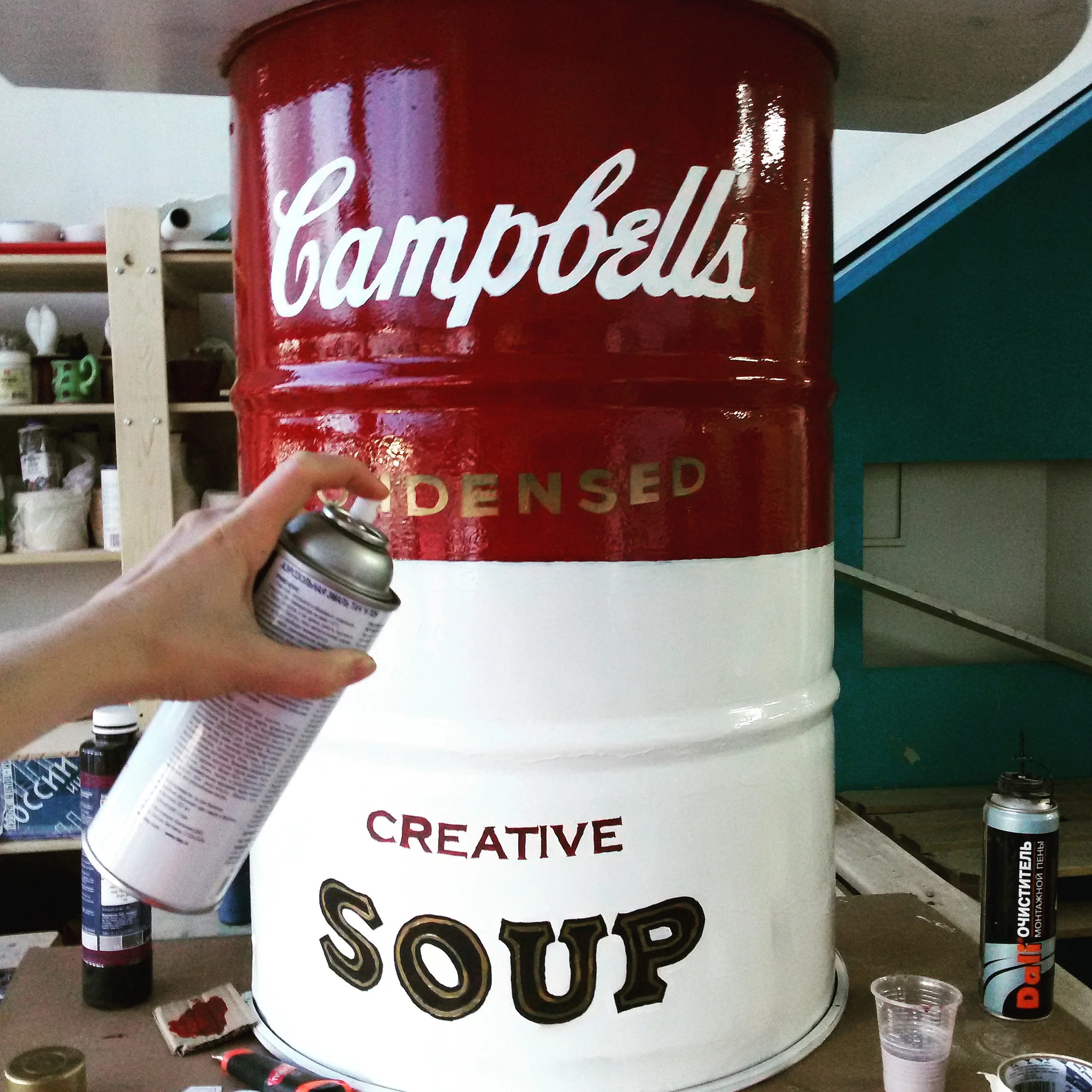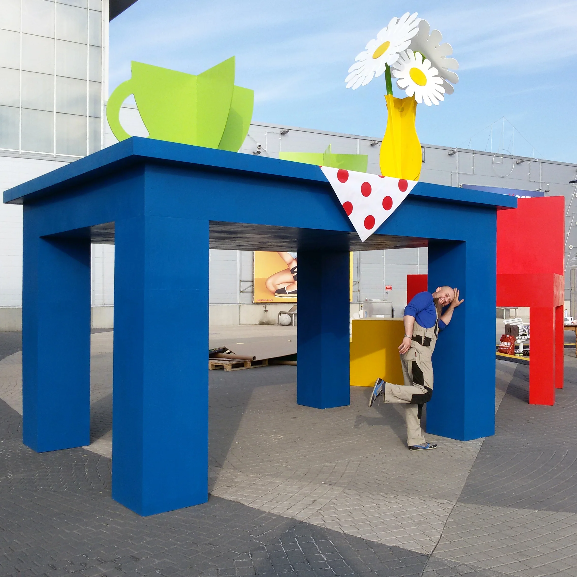И так, по порядку. Согласно эскизам, нам необходимо было изготовить следующие объекты: ГИГАНТСКИЙ СТОЛ длиной 5 метров, шириной 3 метра и высотой 2,5 метра; на столе должен находится ГИГАНТСКИЙ НАБОР ЧАЙНОЙ ПОСУДЫ на две персоны и БУКЕТ РОМАШЕК В ВАЗЕ высотой 1,5 метра; рядом со столом будет расположен ГИГАНТСКИЙ СТУЛ, соответствующего размеру СТОЛА и ЛЕСТНИЦА, по которой обычные люди смогли бы забираться на СТУЛ и попробовать почувствовать себя в роли Дюймовочки. Кроме этих гигантских объектов в нашей Мастерской была сделана "Карамельная зона" для фотографирования с логотипом МЕГА и оригинальный передвижной диджейский пункт в виде, опять таки, гигантской банки Campbells.