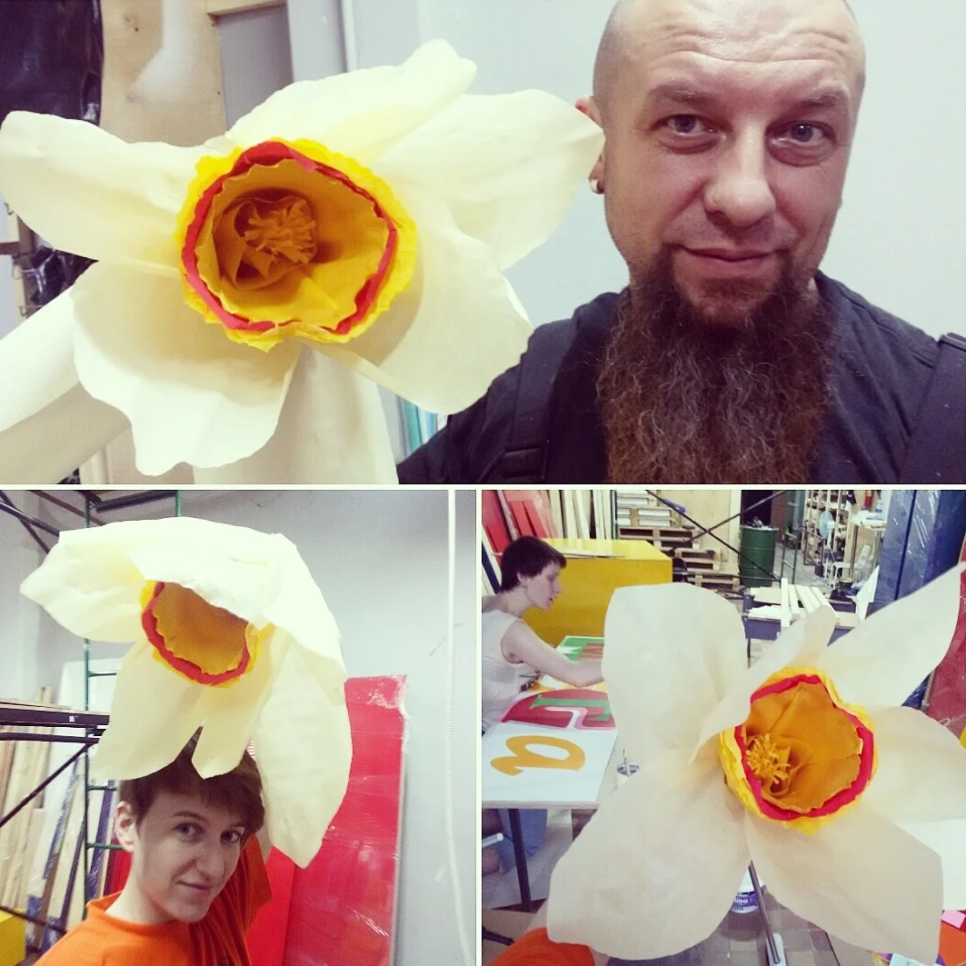 Когда в Мастерскую "Пункт М" приходят друзья и просят сделать к какому то событию что нибудь этакое-разэтакое мы всегда искренне радуемся. На этот раз таким необычным объектом стали три гигантских нарцисса для Ярмарки handmade проводимой творческим объединением ArtFlection. Каркас из металлической сетки, креповая бумага соответствующих цветов, необходимые инструменты, несколько часов кропотливой работы и восхитительные цветы готовы.
