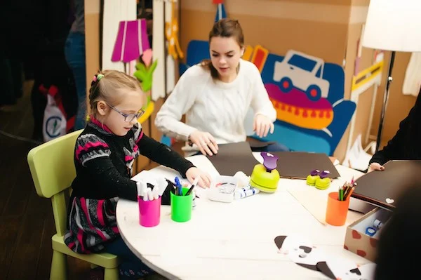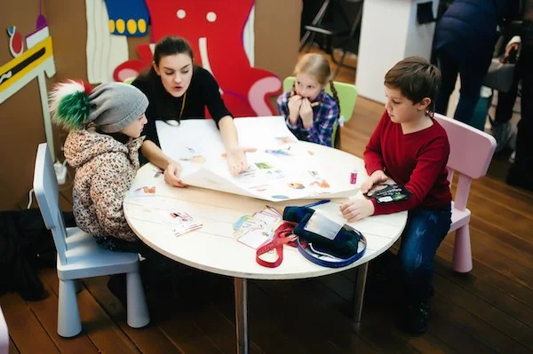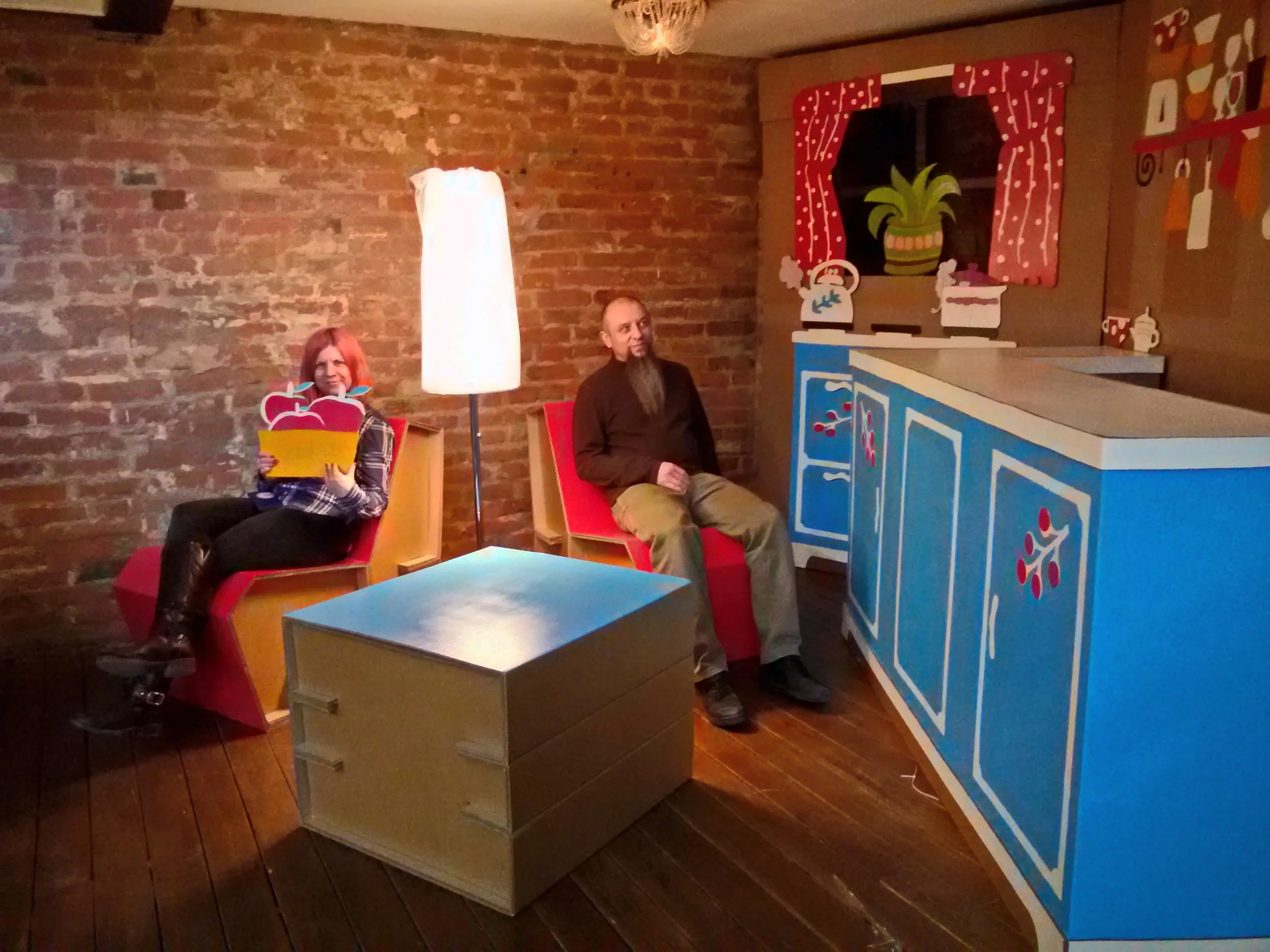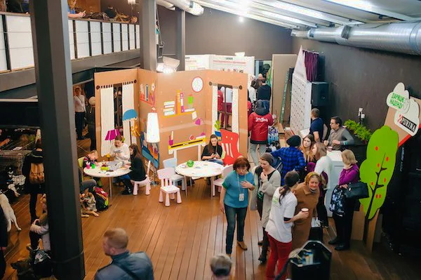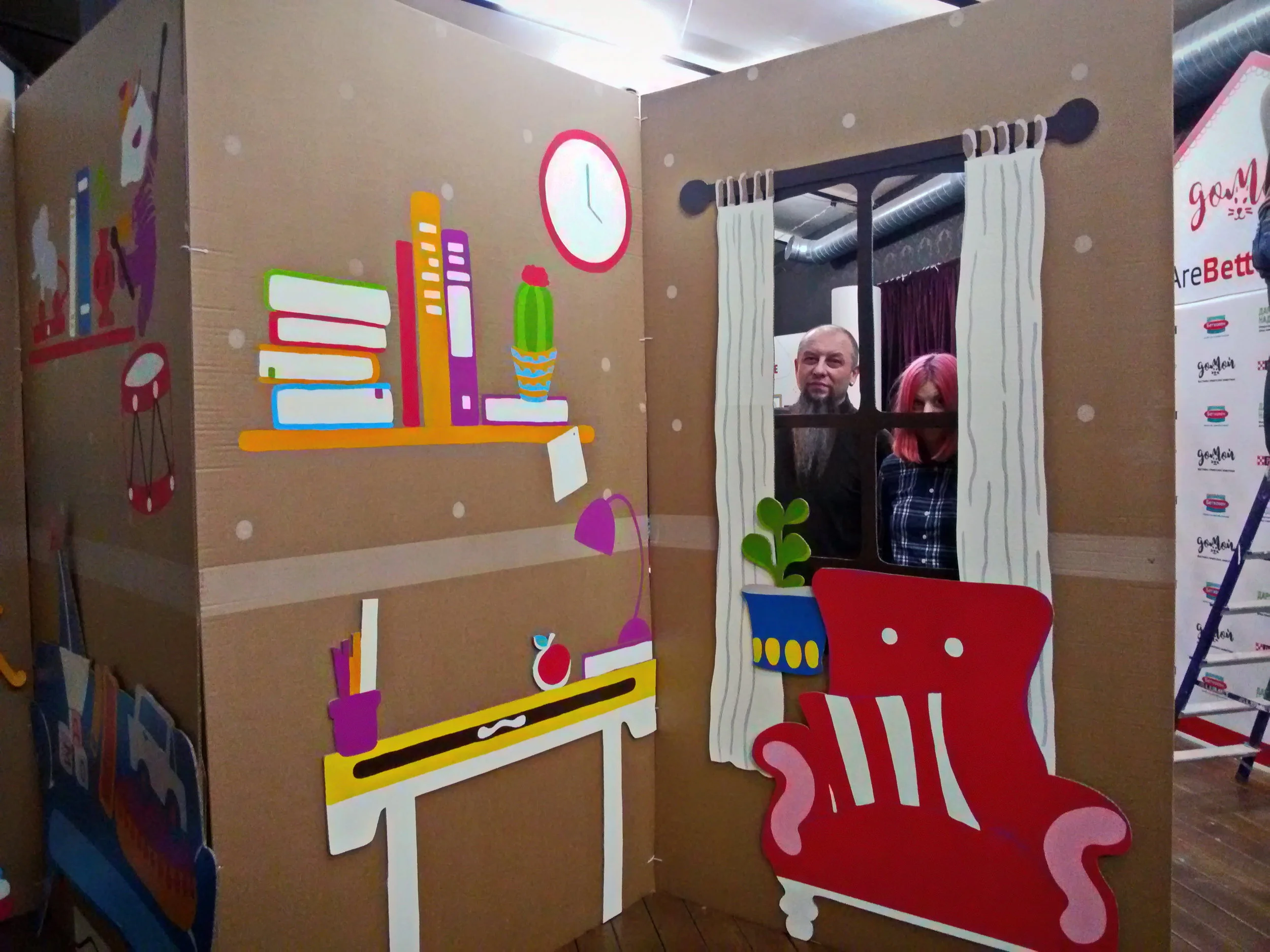 Мы воссоздали интерьер детской и гостиной комнаты, раскрасив элементы картонных декораций в яркие цвета. В них проходи мастер-классы и Уроки Доброты.