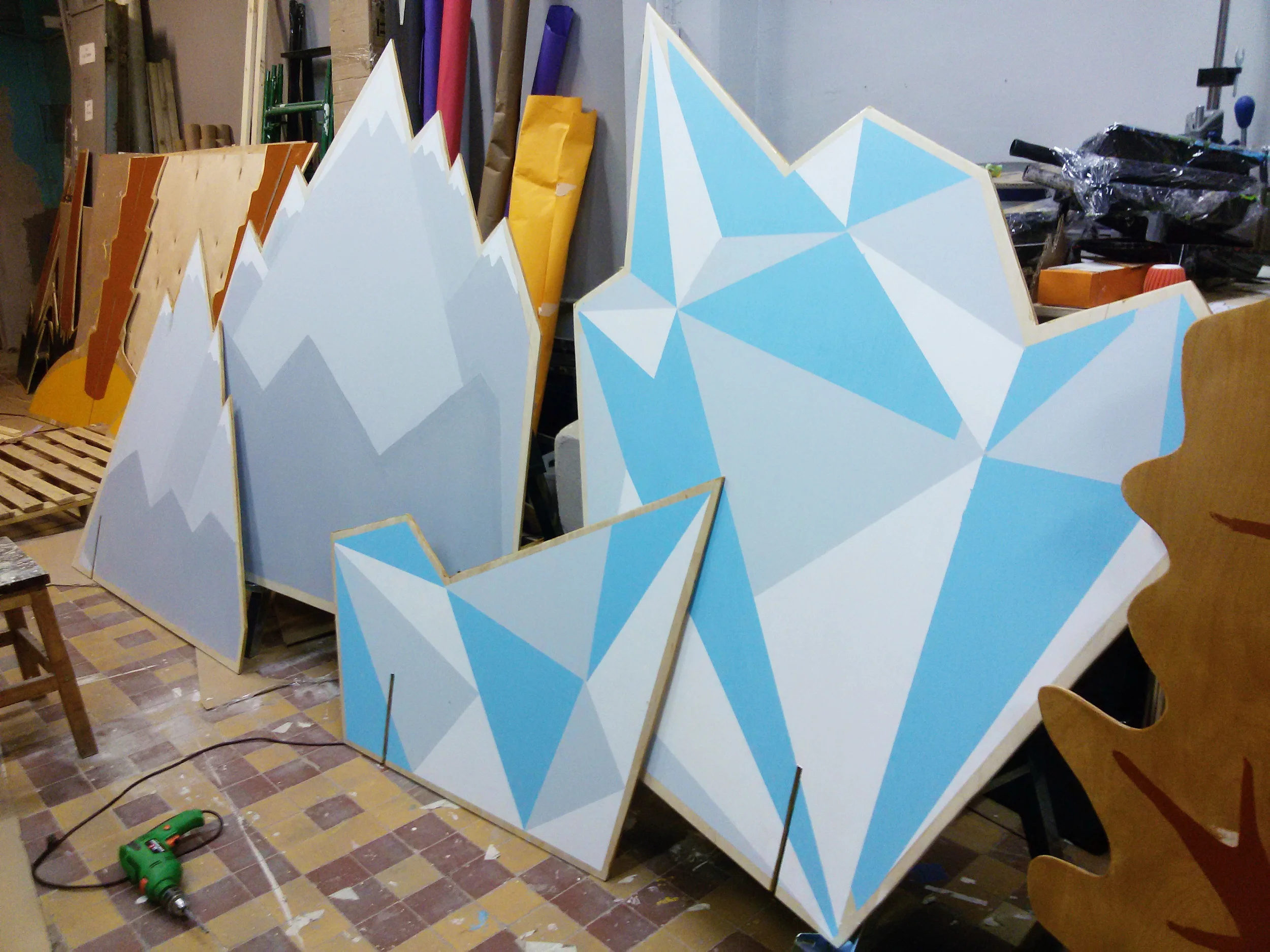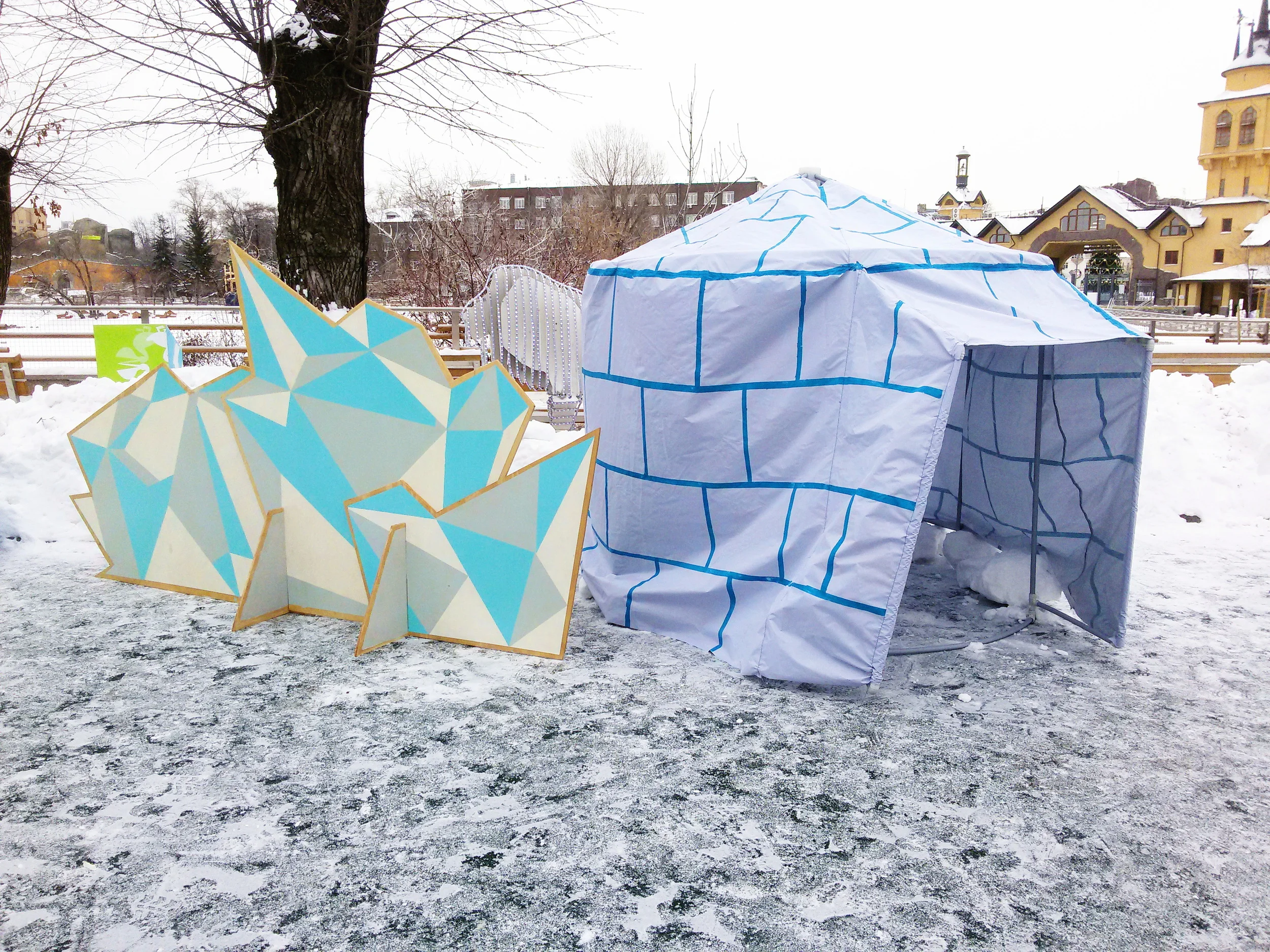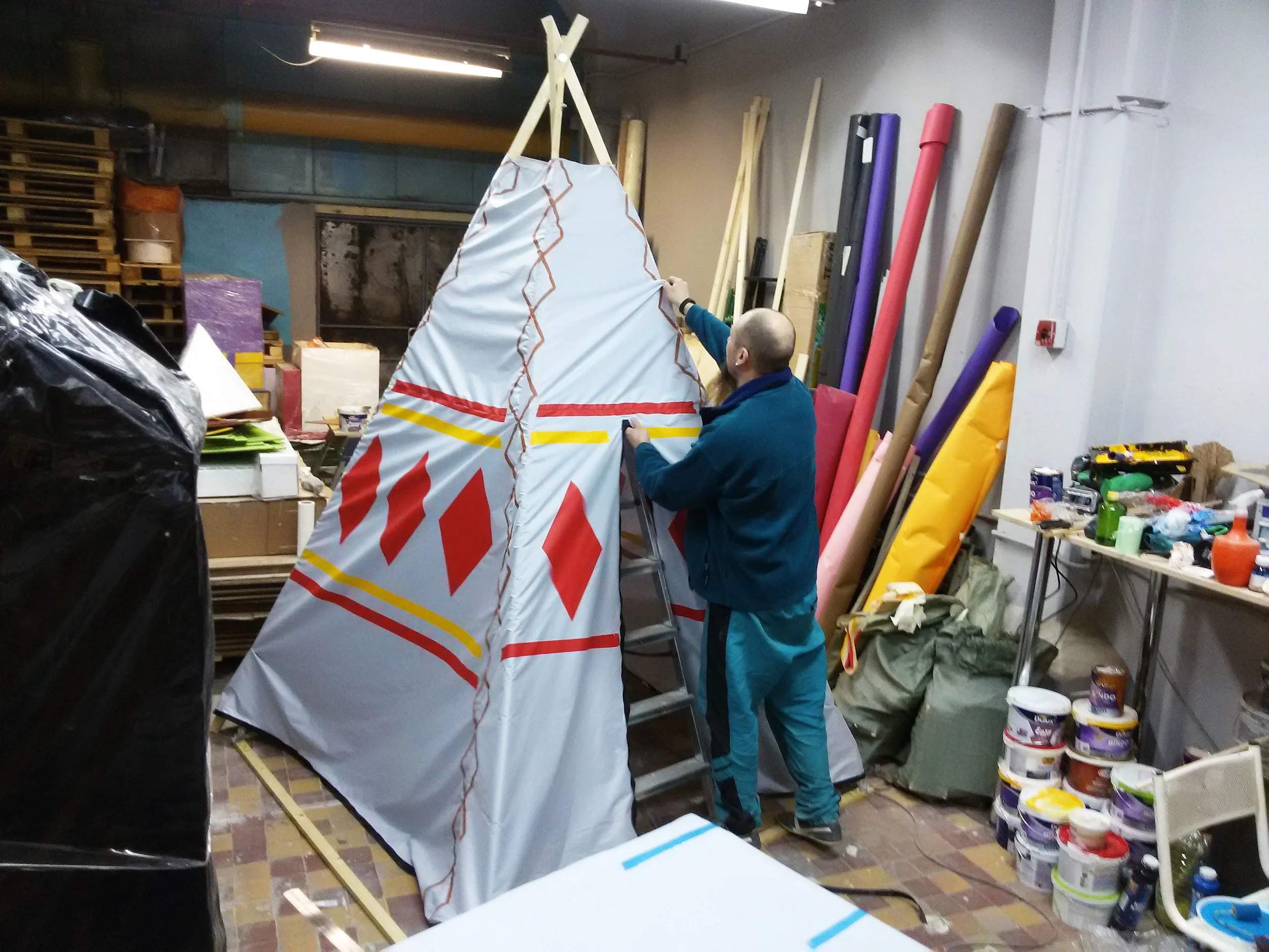 Для производства уличных декораций мы используем влагостойкую фанеру, окрашенную акриловой краской и покрытую несколькими слоями яхтного лака. Таким образом были изготовлены декорации в виде деревьев, горы, льдины и даже индейский костер. Из специальной высокопрочной синтетической ткани в нашей мастерской был сшит ещё один атрибут индейской культуры - вигвам, раскрашенный незатейливыми яркими узорами.